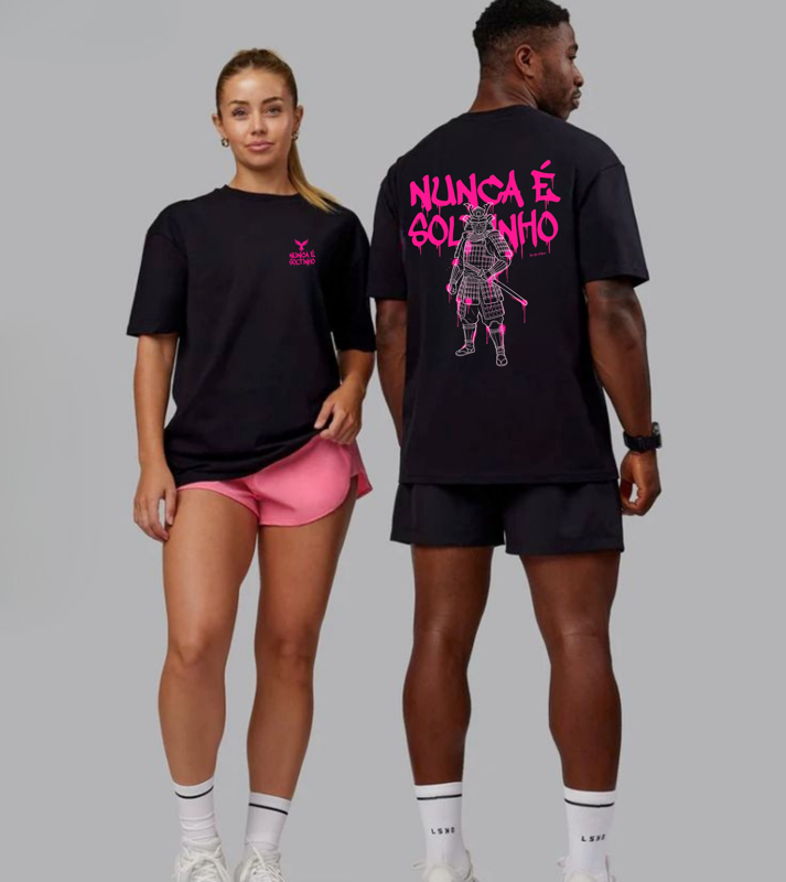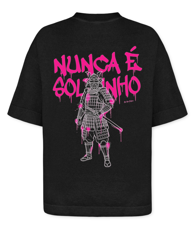 A estampa "Nunca é Soltinho" é um manifesto visual para quem entende que o verdadeiro progresso nasce do esforço real. Unindo a tradição milenar da figura do Samurai à energia vibrante do graffiti urbano, esta peça celebra a resiliência e a busca constante pela maestria. A tipografia bubble em rosa neon, com efeito de tinta escorrendo, traz uma estética moderna e de alto impacto, contrastando a disciplina rÃgida do guerreiro com a liberdade da arte de rua.